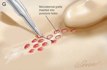 我們就想到了,將皮膚把它切碎,然後一小顆一小顆的種上去的方式,這就是所謂的顯微皮膚移植的方式。